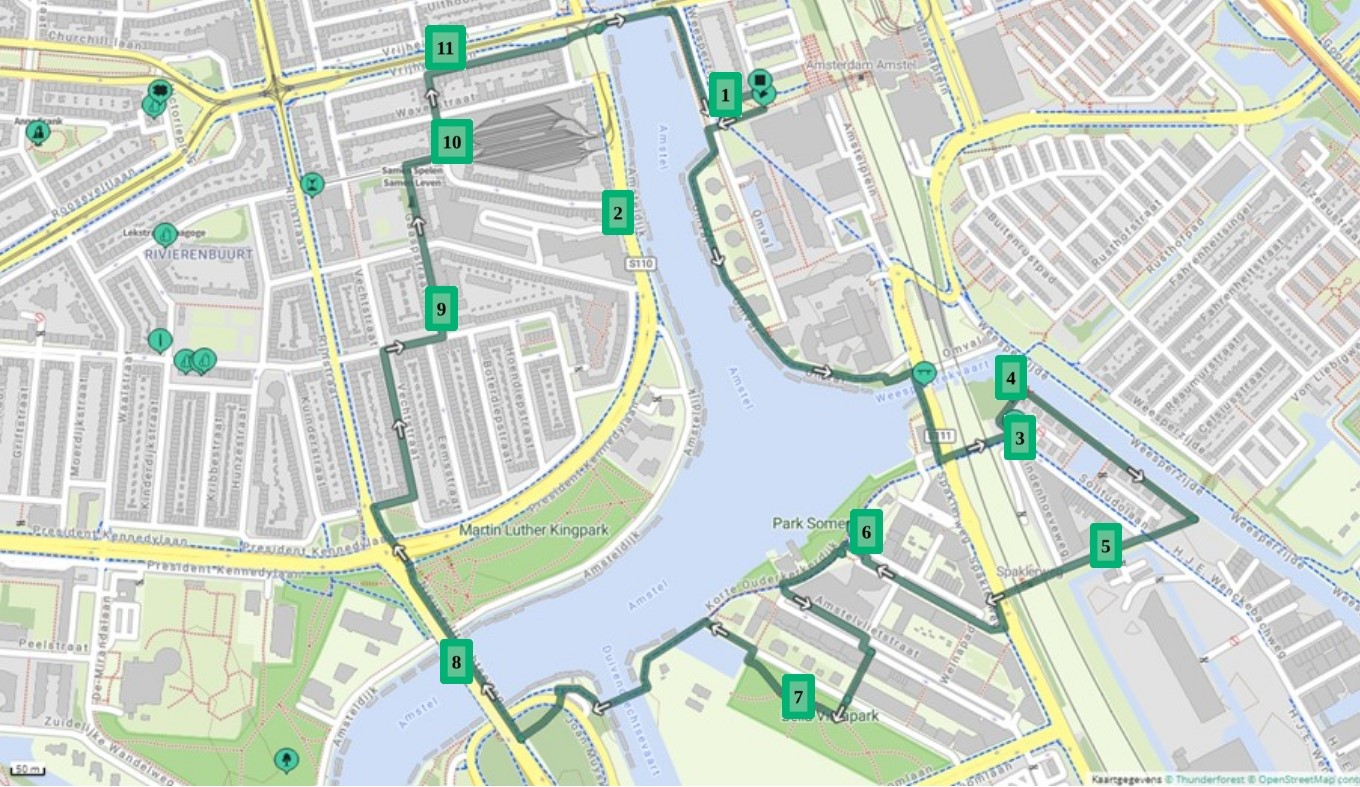 De Omval is de buurt waar de Amstel een kronkel maakt voordat zij de stad verlaat. Hier gebeuren de laatste jaren spannende dingen. Even voorbij het Amstelstation groeien het Amstelkwartier, Overamstel en het Bajeskwartier. We gaan er een kijkje nemen. Dan steken we over naar de Rivierenbuurt, een van de laatst gebouwde buurten van Plan Zuid van Berlage. Wat zijn de verschillen?