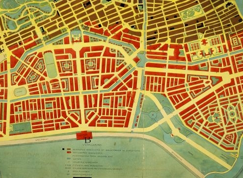 De Rivierenbuurt loopt van de Amstel helemaal tot aan de Boerenwetering, zo’n 2 kilometer verderop. Het stedenbouwkundig plan is gemaakt onder leiding van H.P. Berlage als onderdeel van Plan Zuid. Dit reusachtige project is voor WOI uitgedacht, maar grotendeels erna uitgevoerd. Het zuid-oostelijke deel is pas in de jaren 1934-1935 uitgevoerd, na een grondige vereenvoudigingsronde. Op de foto bij nummer 1 zie je een simpel stratenplan met vier langwerpige, gesloten bouwblokken. Is deze wijk te vergelijken met de nieuwe wijken aan de overkant van de Amstel? Kijk eens naar de vormgeving van de straten, de bouwhoogte en bouwmaterialen, de connectie met de Amstel, de aanwezigheid van erfgoed. Ik zie meer verschillen dan overeenkomsten.