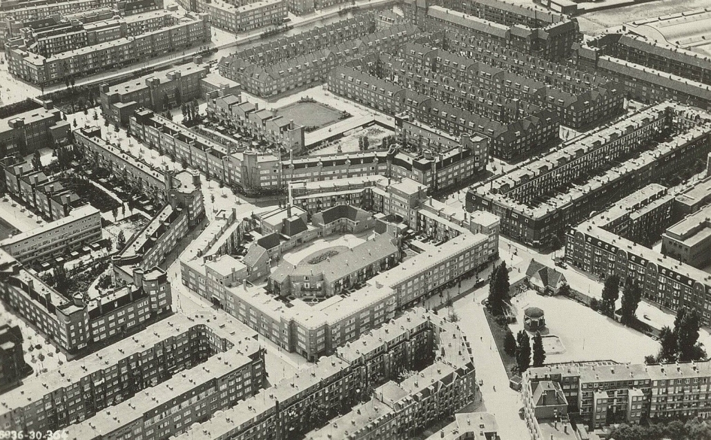 Het Victorieplein was een van de grote verkeerspleinen van het Plan Zuid. Oorspronkelijk heette het Daniel Willinkplein. De grote lanen in deze buurt kregen na de Tweede Wereldoorlog allemaal een nieuwe naam ter herinnering aan het bevrijdingsfeest van mei ’45. Over de Berlagebrug, links, reden toen de geallieerde troepen de stad in en werden blij onthaald door de Amsterdamse bevolking.